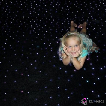 Роскошное оформление пола в Сенсорной комнате. Ковер изготовлен из мягкого ковролина, с вплетенным фибероптическим волокном, которое подсвечивается профессиональным источником на дистанционном пульте управления. Россыпь звезд и космических элементов меняют свои цвета и оттенки, с пульта можно регулировать яркость, задавать различные анимационные и светоэффектов.