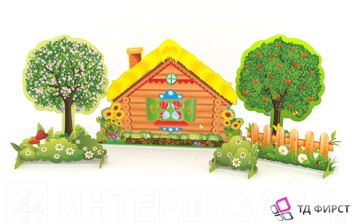 Комплект декораций "Весна-лето" В комплект входит: дом двухсторонний 1 шт.(Артикул 13286); дерево весна-лето 2 шт.(Артикул 9654); кустики 2 шт.(Артикул 10748,10747); заборчик 1 шт.(Артикул 10891)