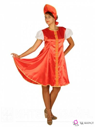 Карнавальный костюм Царевна красная состоит из нарядного пышного платья и кокошника оригинальной формы. Платье выполнено из ярко-красного атласа (крепсатина) и оторочено жаккардовой тесьмой. Белые рукава-фонарики выполнены из воздушной тафеты и обметаны золотой нитью. Платье застегивается на спине липучками. Широкий крой изделия идеально подойдет в том числе и девушкам с пышными формами. Платье красиво развивается в танце и создает подолом очень интересный рисунок. Кокошник под волосами собирается в красивый бант. Цвет и рисунок жаккардовой тесьмы могут отличаться от указанных на фото.