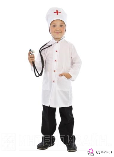 Добрый Доктор Айболит известен не только мальчикам и девочкам, но и, как описано в одноименной сказке, даже всем зверятам в разных странах. Кто не хочет быть похожим на Доктора Айболита? Именно поэтому мы и придумали такой замечательный карнавальный костюм «Доктор». Он очень пригодится для ролевых игр дома и в детском саду, и конечно для различных театральных постановок. Основу костюма составляет белый халат с воротником стоечкой, отделанный декоративными красными пуговицами накладными карманами. На спине халат можно затянуть поясом на талии. Неотъемлемой частью гардероба настоящего доктора является также колпак, украшенный красным крестом. По ширине колпак регулируется завязочками. Костюм универсальный и подходит одинаково как для мальчиков, так и для девочек. Рекомендуем дополнить костюм брюками или юбкой и туфлями.