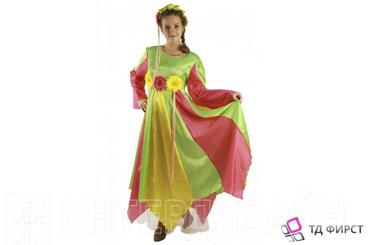 Длинное платье сшито из приятной ткани для сценического образа Лета. Юбка выполнена из клиньев розового, зеленого и желтого цветов, чередующихся между собой. Лиф зеленый, украшен тремя цветочками и лентами в тон.