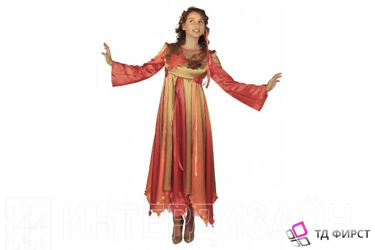 Нарядный комплект, состоящий из платья и головного убора. Наряд выполнен в типичных осенних цветах — золотой, оранжевый и терракотовый. Платье с завышенной талией, длинной в пол, юбка из клиньев вышеперечисленных цветов. Лиф платья со вкусом украшен аппликациями в виде осенних листьев. Рукава длинные, чуть расклешенный к низу.