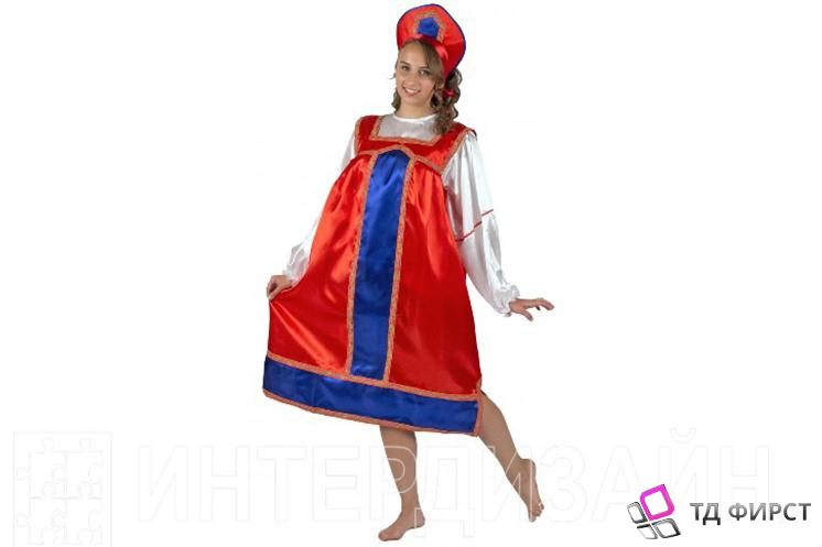 Костюм для создания сценического образа Русской красавицы. Белая рубашка, с широкими рукавами, собранными у запястья на резинку. Сарафан красного цвета, чуть ниже колена, прямого кроя, декорирован синими вставками и небольшими разрезами по бокам. Образ удачно дополнен традиционным кокошником в тон сарафана.