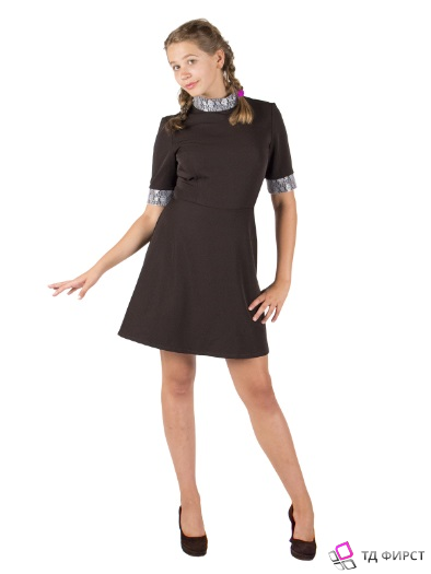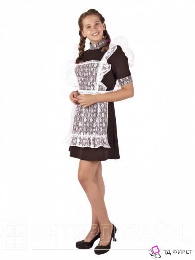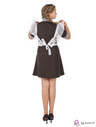 Ностальгия! Школьное прямое платье времен СССР из габардина с отложным воротничком и белый гипюровый фартук с крылышками - лучшее решение для Последнего звонка. Отрезное по талии платье коричневого цвета выполнено из эластичного материала, тянется и не стесняет движения. На спине платье застегивается на молнию. Юбка в широкую складку выполнена по оригинальным лекалам времен СССР. Белый фартук выполнен из прозрачного гипюра с красивым орнаментом. Фартук на спине завязывается на узел или бант.