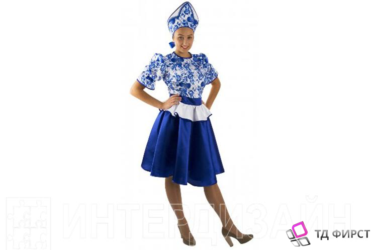 Костюм выполнен в традиционных для стиля Гжель бело-голубых тонах. Юбка клеш, длинна до колена, синего цвета, украшена белой баской с синей окантовкой. Расписной нарядный верх платья с такого же цвета рукавами-фонариками. Наряд гармонично дополнен кокошником в тон с голубой лентой сзади, предназначенной для регулировки размера.