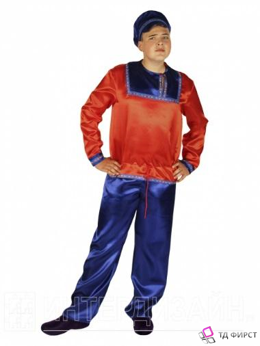 Для традиционного русского костюма характерны сочетание красного и синего цветов. Красный цвет символизирует красоту, синий цвет - силу духа. Все это необходимо для настоящего сильного русского мужчины. Именно поэтому карнавальный костюм Ванюша выполнен в этих ярких и сочных цветах. Красная рубаха-косоворотка украшена жаккардовой синей тесьмой. Манжеты дополнены жаккардовой лентой в цвет полочки. Синие штаны присобраны по талии на резинку. Картуз уплотнен и посажен на резинку по задней стороне изделия. Тонкий шнурок выполняет роль пояса.