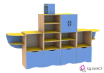 Стеллаж для игрушек «Мореход» состоит из четырех секций, которые соединены между собой межсекционными стяжками, и четырех выдвижных ящиков. Панели выполнены из ЛДСП. Крепление панелей между собой производится с помощью евростяжек. Задние стенки выполнены из ЛДВП. Распашные двери вешаются на мебельные петли. К нижней части секций крепится по четыре опоры-пяты.