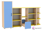 В двух цветовых сочетаниях: стойки бук-натур, фасады светло-синие, полки желтые ИЛИ стойки бук-натур, фасады манго, полки салатовые